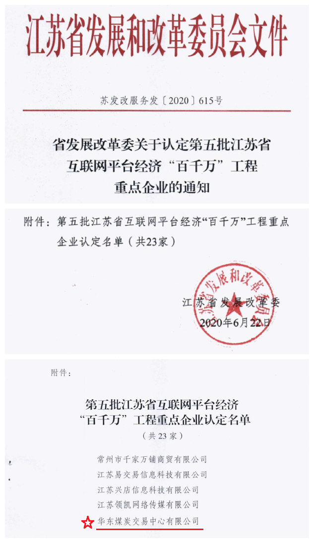 為貫徹落實(shí)《省政府關(guān)于加快發(fā)展互聯(lián)網(wǎng)平臺(tái)經(jīng)濟(jì)發(fā)展的指導(dǎo)意見(jiàn)》(蘇發(fā)〔2015〕40號(hào))文件精神,加快實(shí)施互聯(lián)網(wǎng)平臺(tái)經(jīng)濟(jì)“百千萬(wàn)”工程,經(jīng)省級(jí)主管部門(mén)審核、專(zhuān)家評(píng)審及網(wǎng)上公示等程序,根據(jù)江蘇省發(fā)展和改革委員會(huì)印發(fā)的《省發(fā)展改革委關(guān)于認(rèn)定第五批江蘇省互聯(lián)網(wǎng)平臺(tái)經(jīng)濟(jì)“百千萬(wàn)”工程重點(diǎn)企業(yè)通知》(蘇發(fā)改服務(wù)發(fā)〔2020〕615號(hào))文件,認(rèn)定華東煤炭交易中心有限公司為第五批江蘇省互聯(lián)網(wǎng)平臺(tái)經(jīng)濟(jì)“百千萬(wàn)”工程重點(diǎn)企業(yè)。