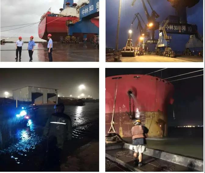 8月9日20時(shí)起,防汛防臺(tái)風(fēng)應(yīng)急響應(yīng)提升為Ⅲ級(jí),如皋港受暴雨襲擊,風(fēng)速10-13級(jí),為確保安全,緊急停止作業(yè),應(yīng)急等候車(chē)輛及時(shí)對(duì)現(xiàn)場(chǎng)作業(yè)人員進(jìn)行安全疏散。8月10日早晨,新民洲大到暴雨,碼頭已全部停止作業(yè);國(guó)林生態(tài)產(chǎn)業(yè)城加工區(qū)也已全部停止生產(chǎn),并對(duì)各加工現(xiàn)場(chǎng)進(jìn)行全部停電處理。8月10日上午,如皋海事局領(lǐng)導(dǎo)、南通引航站領(lǐng)導(dǎo)、南通交通局和如皋交通局領(lǐng)導(dǎo)先后到如皋港區(qū)視察防臺(tái)防汛工作,領(lǐng)導(dǎo)們對(duì)1號(hào)泊位在港海輪系掛攬繩情況、門(mén)機(jī)防風(fēng)措施準(zhǔn)備情況以及人員值守情況做了具體要求。