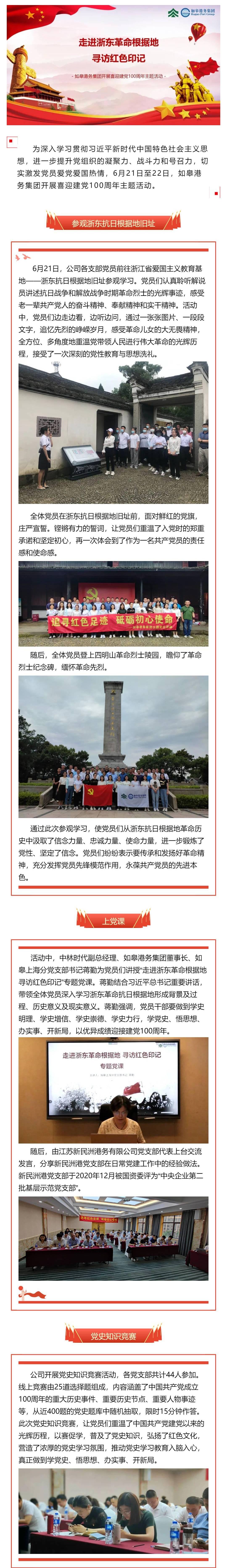 為深入學習貫徹習近平新時代中國特色社會主義思想,進一步提升黨組織的凝聚力、戰(zhàn)斗力和號召力,切實激發(fā)黨員愛黨愛國熱情,6月21日至22日,如皋港務(wù)集團開展喜迎建黨100周年主題活動。